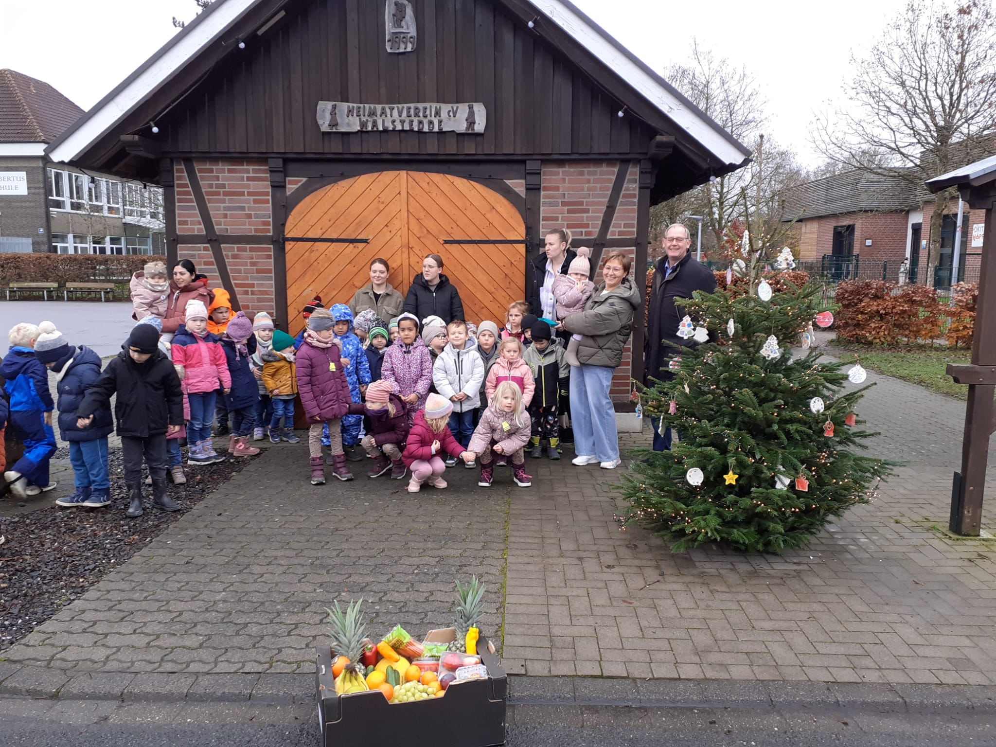 Unsere Kindergartenkinder haben voller Begeisterung ihren selbstgebastelten Schmuck aufgehängt und dem Baum ein wunderschön buntes Kleid verpasst. Als Dankeschön gab es vom Heimatverein einen großen Früchtekorb für ein gesundes Frühstück – die Freude war riesig!