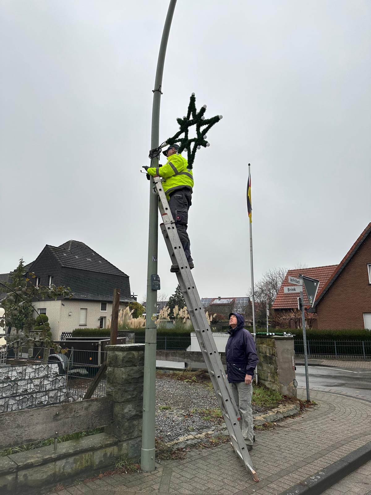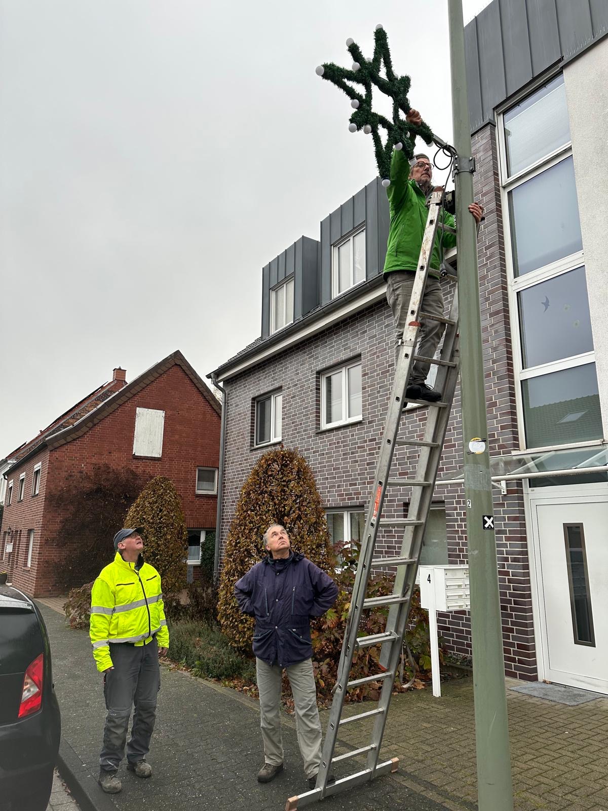 Bevor Walstedde in festlichem Glanz erstrahlen konnte, war unser Vorstandsteam wieder fleißig unterwegs: Leiter aufstellen, Kabel sortieren, Sterne einhaken – und das alles mit einer guten Portion Humor und Teamgeist.